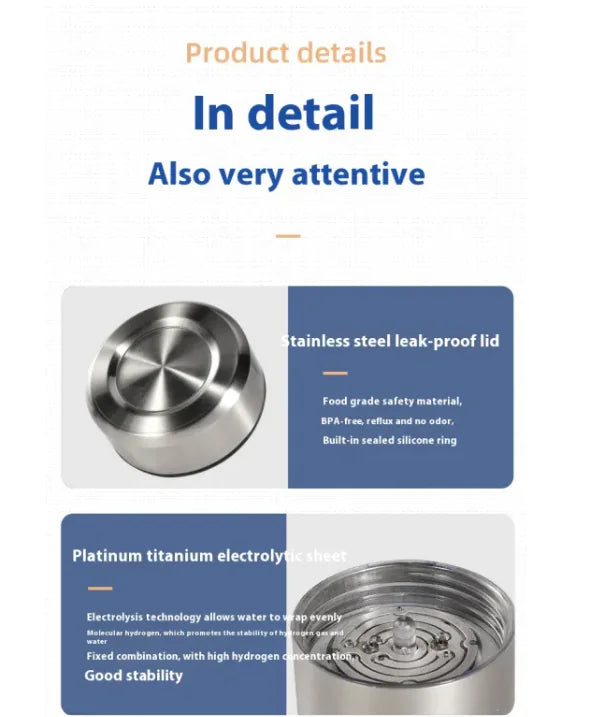 An innovative hydrogen-rich cup designed for hydrogen-oxygen separation, providing pure hydrogen-infused water to support a healthier lifestyle. With advanced technology and a sleek design, this cup is portable, easy to use, and perfect for daily hydration. Ideal for health enthusiasts seeking improved wellness through hydrogen water.
